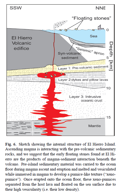 Troll, V.R., Klügel, A., Longpré, M.-A., Burchardt, S., Deegan, F. M., Carracedo, J. C., Wiesmaier, S., Kuepper, U., Dahren, B., Blythe, L. S., Hansteen, T., Freda, C., Budd, D., Jolis, E. M., Jonsson, E., Meade, F. C., Harris, C., Berg, S. E., Macini, L., Polacci, M., and Pedroza, K. 2012. Floating stones off El Hierro, Canary Islands: xenoliths of pre-island sedimentary origin in the early products of the October 2011 eruption. Solid Earth, Vol. 3: 97-110.