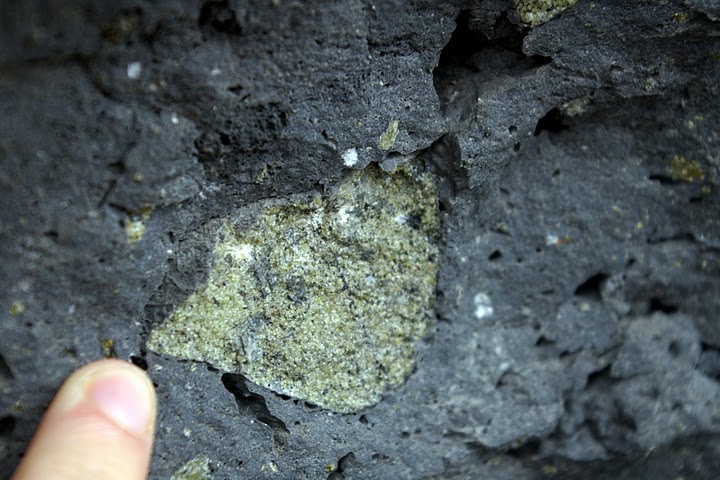 Following a period of intense seismic activity, on October 10th, 2011 a submarine eruption began approximately 1 kilometer off the coast of El Hierro, the youngest and westernmost island in the Canary Islands, which is a group of volcanic islands believed to have been formed through hotspot volcanism. The eruption was evident from the unusual conditions on the sea surface: the sea bubbled, like a Jacuzzi, and was stained green. The large green stain was easily observable from space. In the midst of these strange conditions, some highly unusual rocks were erupted. For several days after the sea started bubbling, strange floating rocks were observed and collected off the coast of La Restinga, the closest town to the undersea eruption. These floating stones were generally tens of centimeters in size and resembled lava bombs in shape. The outsides of these floating rocks consisted of basanite , a rock type commonly observed in the Canary Islands and other volcanic ocean islands. Basanites don’t generally float. However, these basanite shells floated because their insides were filled with a white to light grey, pumice-like material. Pumice is a highly vesicular rock, which means that it is a rock full of voids or bubbles, which make the rock light enough to float on water.